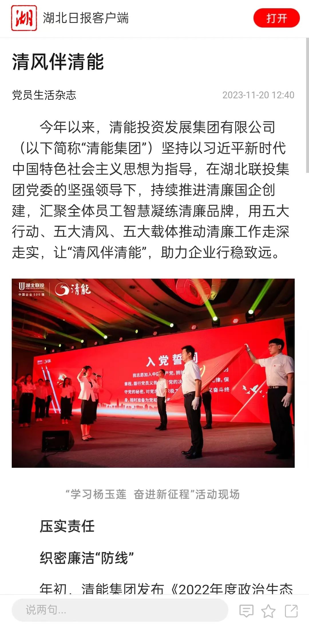 今年以來,聯(lián)投·清能投資發(fā)展集團(tuán)有限公司(以下簡稱“清能集團(tuán)”)堅持以習(xí)近平新時代中國特色社會主義思想為指導(dǎo),在湖北聯(lián)投集團(tuán)黨委的堅強(qiáng)領(lǐng)導(dǎo)下,持續(xù)推進(jìn)清廉國企創(chuàng)建,匯聚全體員工智慧凝練清廉品牌,用五大行動、五大清風(fēng)、五大載體推動清廉工作走深走實,讓“清風(fēng)伴清能”,助力企業(yè)行穩(wěn)致遠(yuǎn)。
