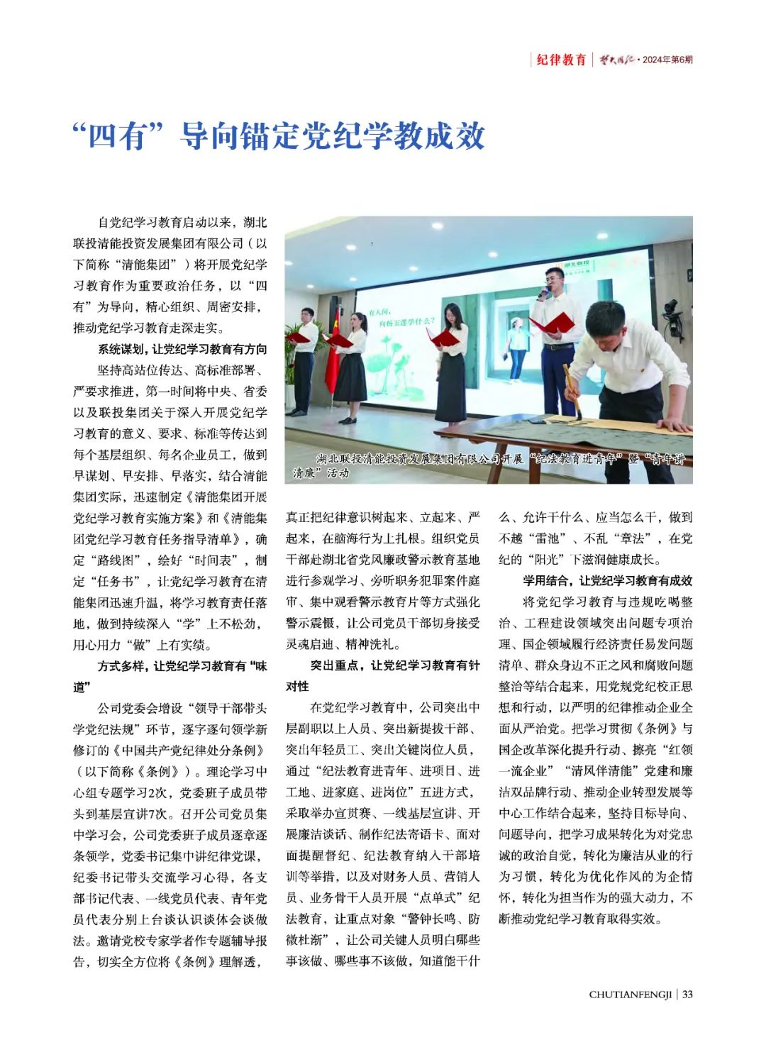 由中共湖北省紀(jì)律檢查委員會(huì)、湖北省監(jiān)察委員會(huì)主辦的《楚天風(fēng)紀(jì)》在今年6月報(bào)道清能集團(tuán)紀(jì)律教育開展情況,標(biāo)題為《“四有”導(dǎo)向錨定黨紀(jì)學(xué)教成效》。全文報(bào)道如下: